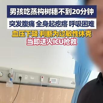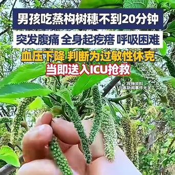 信息来源:《3月28日 河南许昌,男孩吃蒸构树穗不到20分钟,突发腹痛 全身起疙瘩 呼吸困难,血压下降 判断为过敏性休克,当即送入ICU抢救》大象新闻