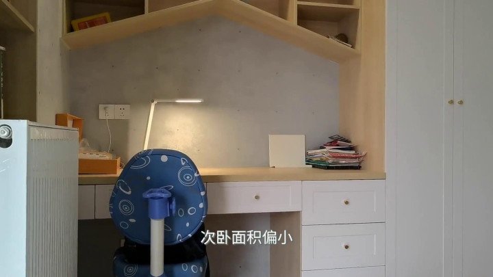 ·次卧面积偏小,定制L型衣柜+书柜+书桌组合。1.2m小床靠窗,书桌开放格收纳课本文具。衣柜三段式分区,收纳有序。书房多功能设计,靠窗悬浮书桌可双人办公,桌下抽屉收纳充足。嵌入式衣柜与主卧呼应,剩余空间放小床,兼顾办公、临时客房和储物。