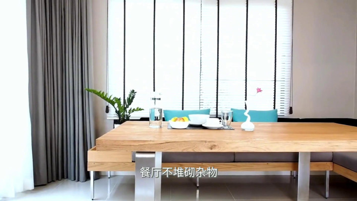 ·餐厅不堆砌杂物,靠墙放餐桌+藤编餐椅,亚克力桌腿通透高级。墙面弱电箱用装饰化遮挡,美观又便利。